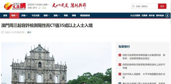 Can I enter Macau if I test positive now?发表时间:2022-12-02 17:31 Dagong Wenhui All Media Report: Macao announced that it will adjust the requirements for new coronavirus nucleic acid test certificates for people entering Hong Kong, Taiwan or overseas countries and regions from 0:00 on Wednesday (30th), even if positive, but CT value of 35 or above can also enter. 大公文汇全媒体报道:澳门宣布,星期三(30日)零时起调整由香港、台湾或海外国家和地区入境人士的新冠病毒核酸检测证明要求,即使阳性,但CT值35或以上人士亦可入境。